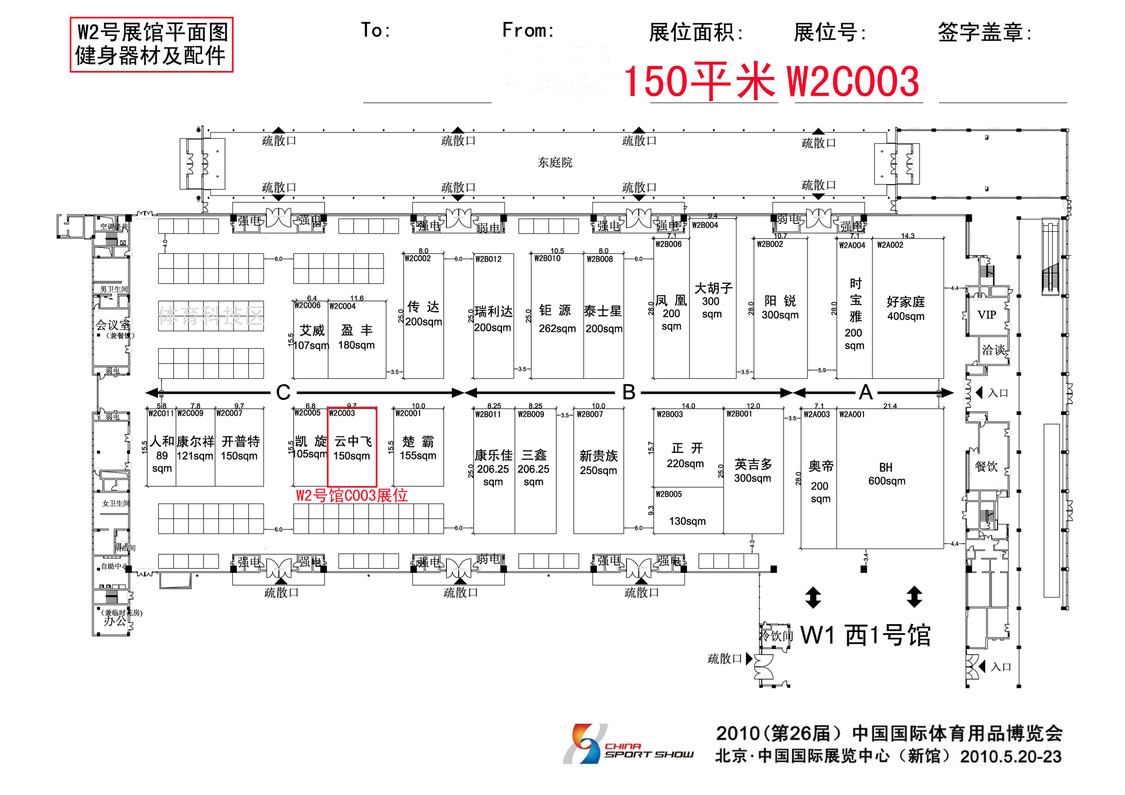 2010年(第26屆)中國國際體育用品博覽會在北京國際展覽中心(新館)舉行,時間是 5月20-23日,體博會展位圖已經(jīng)確定下來,我司展位是W2號館C003展位,屆時歡迎各位客戶光臨指導!